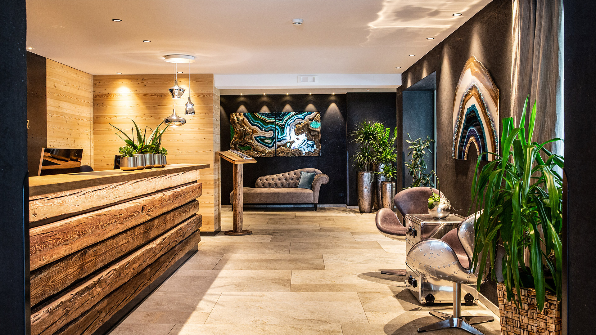 La reception, realizzata con travi recuperate da un vecchio maso della Val Badia, accoglie calorosamente gli Ospiti al loro arrivo.