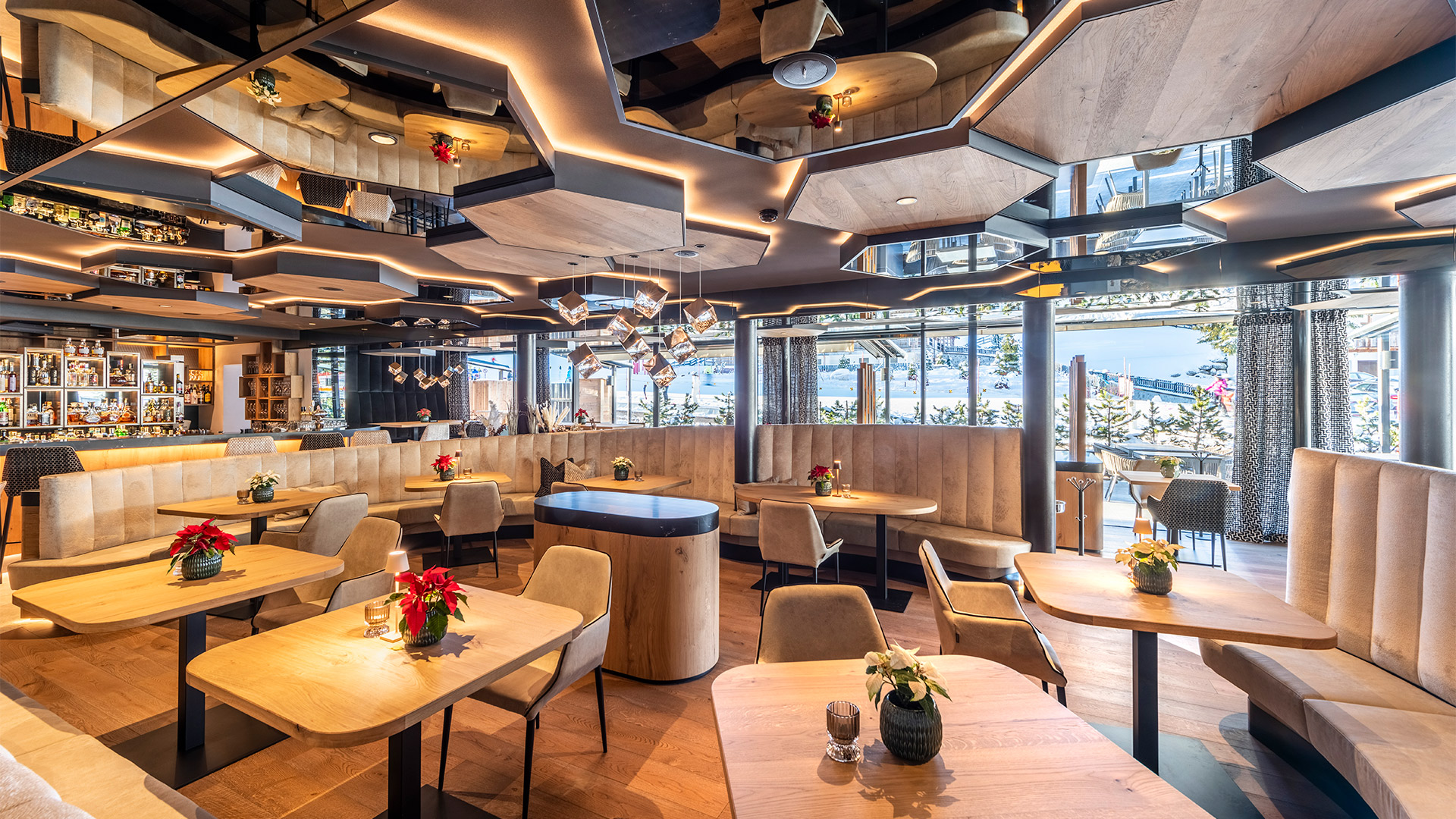 Il bar dell’Hotel Arkadia, rinnovato nell’autunno 2023, è caratterizzato da ambienti luminosi e ricercati. È un vero piacere sorseggiare una tazza di tè, un aperitivo o un buon bicchiere di vino al bar del nostro hotel a Corvara. Il bar è suddiviso in tre distinte zone: il banco bar con le sedute alte, la parte centrale con le sedute basse e infine la terrazza. Tre diverse situazioni, per venire incontro alle molteplici esigenze dei nostri Ospiti.
