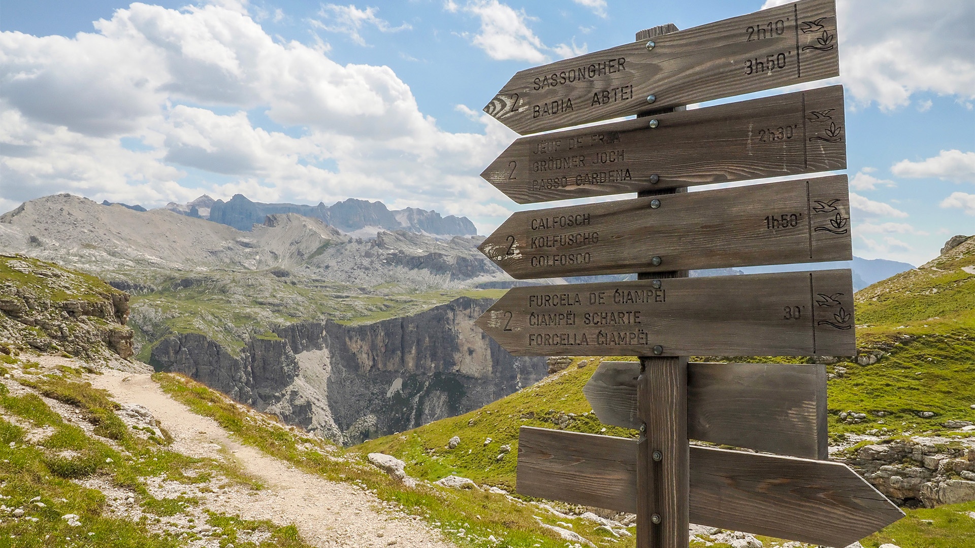 Itinerario: La Villa (1.420 m) - Plan de Sponata (1.750 m/seggiovia) - Rifugio Gardenaccia (2.050 m) - Forcella Gardenaccia (2.548 m) - Rifugio Puez (2.475 m) - Forcella Ciampai - Colfosco - Corvara (1.550 m)